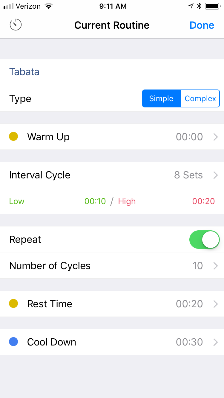 Timing yourself while doing Tabata is a nightmare if you don’t have an app for it or a specific Tabata timer. I use a free app called Interval Timer (for HIIT Workouts) that I set up for a Tabata workout. Here is a screen shot of my set up: